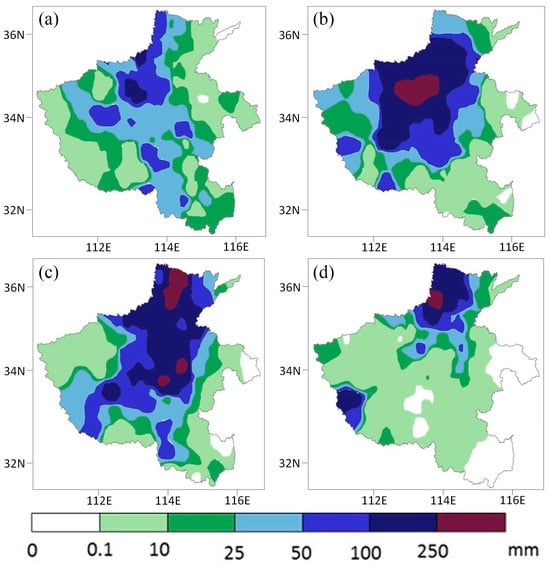 Observed daily rainfall amounts in Henan Province on (a) 18, (b) 19, (c) 20, and (d) 21 July 2021.