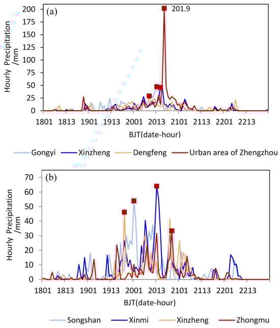 Figure 3a,b display the variations in hourly rainfall intensity from 18 to 22 July. It is revealed that the maximum hourly rainfall intensities are 47.4 mm·h−1, 45.8 mm·h−1, 29.2 mm·h−1, 201.9 mm·h−1, 53.9 mm·h−1, 64.0 mm·h−1, 46.2 mm·h−1 and 33.4 mm·h−1 at Gongyi, Xingyang, Dengfeng, Zhengzhou urban district, Songshan, Xinmi, Xinzheng and Zhongmu Station, respectively, among which the maximum hourly rainfall intensity of 201.9 mm·h−1 recorded at Zhengzhou urban district station has broken the historical record since its establishment in 1951.