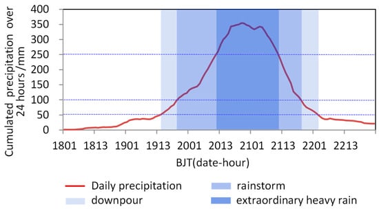 According to a national standard in China, the Grade of Precipitation (GB/T 28592-2012), the precipitation amounts are classified into the following three grades: rainstorm (with 24 h accumulated precipitation between 50.0 mm and 99.9 mm), downpour (with 24 h accumulated precipitation between 100.0 mm and 249.9 mm), and extraordinary heavy rain (with 24 h accumulated precipitation above 250.0 mm). Based on the area-averaged hourly rainfall intensity over the whole Zhengzhou city from 0000 BJT on 18 July to 2300 BJT on 22 July 2021, a moving average technique is performed on 24 h accumulated rainfall amounts, as shown in Figure 4. It can be seen that the precipitation amount reaches the grade of rainstorm during the period from 1400 BJT on 19 July to 2000 BJT on 19 July and 2000 BJT on 21 July to 0200 BJT on 22 July (with a duration of 12 h), reaches the grade of downpour from 2100 BJT on 19 July to 1100 BJT on 20 July and 1200 BJT on 21 July to 1900 BJT on 21 July (21 h), and reaches the grade of extraordinary heavy rain from 1200 BJT on 20 July to 1100 BJT on 21 July (23 h).