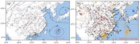 Fields of geopotential height and wind at (a) 500 hPa and (b) 850 hPa at 0800 BJT on 20 July 2021. D and G are low- and high-pressure systems, respectively.