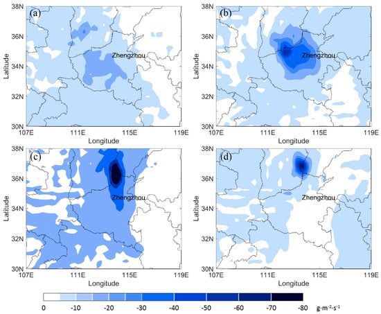 Daily accumulated vertical integrals of water vapor flux divergence on (a) 18, (b) 19, (c) 20, and (d) 21 July 2021. The result in Figure 6 was generated after the water vapor flux data were processed by Matlab R2016b software.
