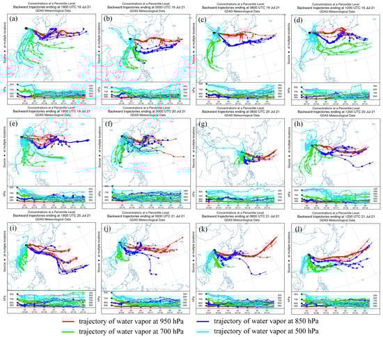 The water vapor trajectory tracking scheme is as follows. Firstly, the geographic locations of the 8 meteorological observation stations in Figure 1c with large rainfall amounts during this rainstorm process in Zhengzhou are selected as the initial positions for water vapor trajectory tracking. Next, considering that the atmospheric water vapor mostly concentrates in the middle and lower levels of troposphere [,], and the water vapor sources and channels vary with height during rainstorm processes, the isobaric levels 950 hPa, 850 hPa, 700 hPa and 500 hPa are selected as the initial heights for water vapor trajectory tracking. Finally, according to the temporal variation in rainfall intensity in Figure 2, the tracking period is set to 7 days. Starting from 0200 Beijing Time (BJT), 0800 BJT, 1400 BJT, and 2000 BJT from 19 to 21 July 2021, the backward trajectories of air parcels over a 7-day (168 h) period are simulated by the HYSPLIT model. The trajectory positions are output every 6 h to generate 384 trajectories in total (8 spatial initial points × 4 levels × 12 temporal initial points).