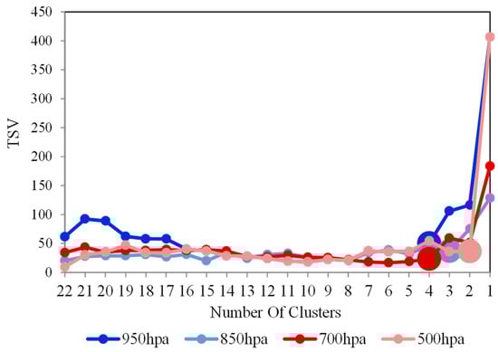 Figure 8 demonstrates the TSV variations during the clustering process of water vapor trajectories at different levels. The TSV at 950 hPa increases sharply after the number of clusters drops to below 4. Therefore, the optimal clustering number at 950 hPa is 4. That is, there are four main water vapor transport channels at 950 hPa. Similarly, the optimal values of clustering numbers are 3, 4 and 2 for water vapor trajectories at 850 hPa, 700 hPa and 500 hPa, respectively. Hence, there are three, four and two main water vapor transport channels at the above three levels, respectively.