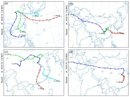 Spatial distributions of water vapor transport channels at (a) 950 hPa, (b) 850 hPa, (c) 700 hPa, and (d) 500 hPa. The numbers at the end of each clustered trajectory line represent a specific cluster number, and the numbers in brackets indicate the proportion of the number of trajectories of this cluster to the total trajectories. The red, blue, green and lake blue solid lines represent the first, second, third and fourth clustered trajectories, respectively. The solid lines of red, blue, green and lake blue represent the 1–4 clustering tracks. The black star represents Zhengzhou city.