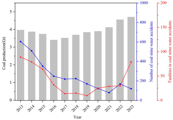 - Zeng, Y.; Wu, Q.; Zhao, S.; Miao, Y.; Zhang, Y.; Mei, A.; Meng, S.; Liu, X. Characteristics, causes, and prevention measures of coal mine water hazard accidents in China. Coal Sci. Technol. 2023, 51, 1–14. [Google Scholar]