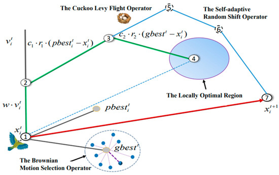 - Based on the current global optimal individual, combine the Brownian motion step formula to form the potential states of the current optimal individual, construct the state space, calculate the fitness function value corresponding to each state, and update the current global optimal individual optimally;