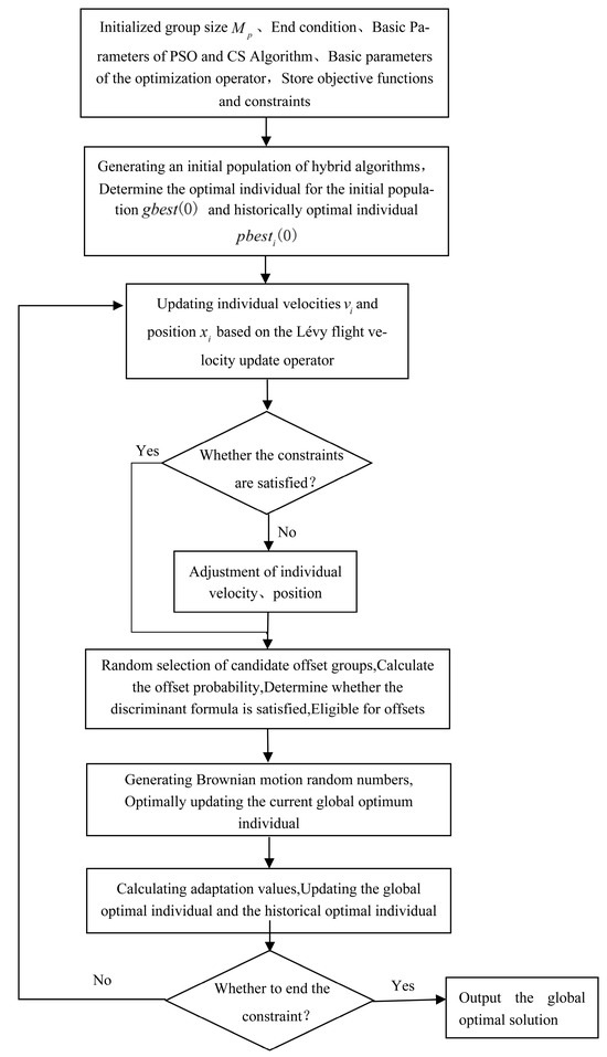 - Output the global optimal solution. The PSO-CS algorithm flow is shown in Figure 3.