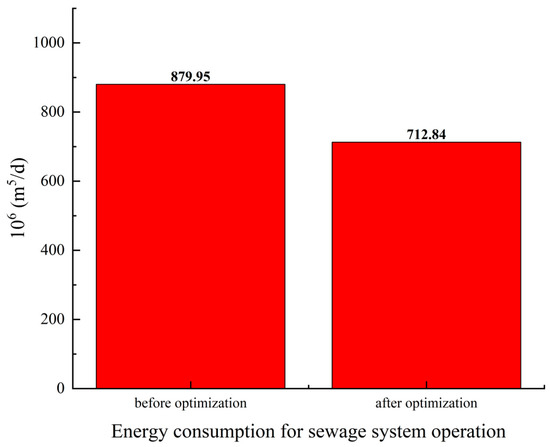 - The operational energy consumption of the sewage system was effectively reduced after optimization. The total operational energy consumption generated by the scheduling program on the same day was reduced from 879.95 × 106 m5/d to 712.84 × 106 m5/d, and the operational energy consumption of the sewage system after optimization was 19% lower than that of the system before optimization;