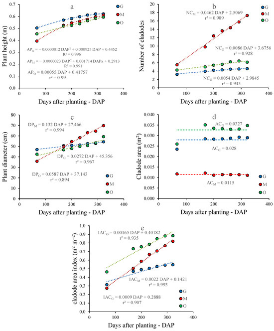 Means of plant height (a), number of cladodes (b), plant diameter (c), cladode area (d), and cladode area index (e), as a function of days after planting, for forage cactus pear cultivars Gigante (G), Miúda (M), and Orelha de Elefante Mexicana (O).