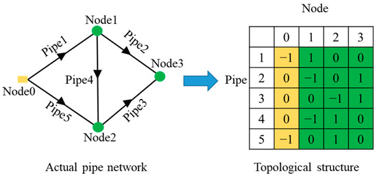 In Figure 1, −1 represents the direction of the pipe starting from the node, 1 represents the direction of the pipe ending at the node, and 0 indicates no direct connection between the node and the pipe. The yellow and green grids represent the topological relationships between pipes and known/unknown head nodes. This transformation relationship converts the actual pipeline network into a topological structure.
