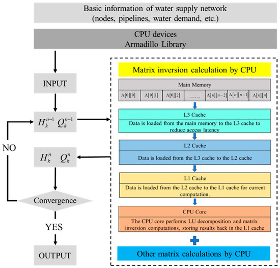 Below is the flowchart for gradient computation in a water distribution network based on the CPU architecture using the Armadillo library. The model constructs a topological matrix of the computational equations by reading the basic information of the network. The state of the network at time T = n − 1 is input into the CPU architecture, where linear calculations are performed using the Armadillo library. Convergence of the computation results is evaluated to determine whether to proceed with the next iteration or output the final results. Due to the complexity and necessity of matrix inversion, the flowchart primarily highlights the matrix inversion process under the CPU architecture, as detailed below:
