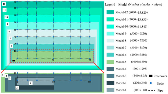 Regarding the sample size, 10 different network structures, from Model-1 to Model-10, were selected, with node counts ranging from 100 to 6000, representing urban water supply networks of various regional scales, as shown in Figure 3. Specifically, Model-1 to Model-3 represent community-level networks with 100, 200, and 500 nodes, respectively; Model-4 to Model-6 represent constituency-level networks with 700, 1000, and 2000 nodes; Model-7 and Model-8 represent district-level networks with 3000 and 4000 nodes; and Model-9 and Model-10 represent city-level networks with 5000 and 6000 nodes. The sample size was chosen to cover a range of network complexities, from small to large-scale networks, ensuring broad applicability and reliability of the model results across different network scales. This approach allows for a comprehensive analysis of improvements in computational efficiency under various conditions. Since the models are self-constructed, the node attributes were uniformly configured for ease of modeling, as shown in Table 2.