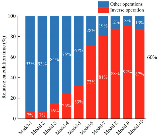 By extracting the total computation time and matrix inversion time from each model within the CPU computation framework, the main factors limiting the efficiency of water distribution network calculations were analyzed, as shown in Figure 4. It was observed that for models with fewer than 1000 nodes, most of the computation time is consumed by matrix operations other than inversion. However, for models with more than 1000 nodes, the majority of computation time is spent on matrix inversion. In the most extreme cases, up to 92% of the total computation time is dedicated to inverting large matrices. This finding underscores that improving the efficiency of matrix inversion is a critical factor in enhancing the overall computation efficiency when using gradient algorithms to solve large-scale urban water distribution network models.