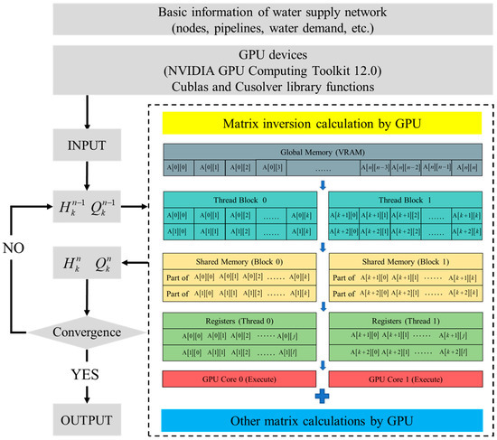 Based on the computational results using the CPU architecture, this study transitions to using a GPU architecture to solve the water distribution network equations in order to improve computational efficiency. Earlier GPUs had several limitations when performing matrix inversion, including restrictions due to single-precision floating-point operations, the complexity of parallel computations, memory bandwidth bottlenecks, and limited support from development tools and libraries. These issues resulted in inadequate precision, low efficiency, and increased development difficulty for matrix inversion operations. However, the latest versions of CUDA have addressed these issues by supporting double-precision floating-point operations, optimizing parallel computing models, enhancing memory management efficiency, and providing powerful mathematical libraries. These improvements have significantly enhanced the performance and accuracy of matrix inversion on GPUs, enabling them to handle complex matrix operations more efficiently and reliably. Therefore, unlike the findings by Corus et al., current GPU hardware and corresponding libraries now meet the precision and efficiency requirements for inverting large matrices, making them suitable for building large-scale urban water distribution network models [22].