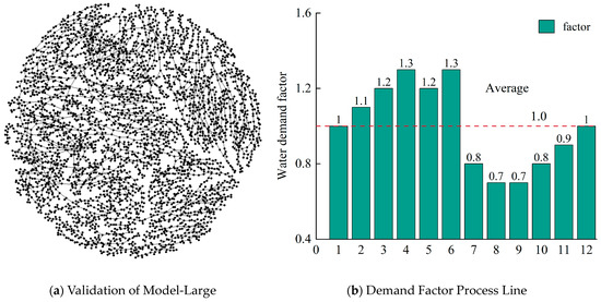 The water distribution network is a vital component of modern urban infrastructure, and as urbanization progresses and population growth continues, the demand for water by residents steadily increases, leading to the continuous expansion of water distribution networks [1,2]. According to recent statistics, the total length of urban water distribution networks in China has reached 1.1 million kilometers, with a water supply volume of 58.65 billion m3. Safe and reliable operation of urban water distribution networks is crucial. However, factors such as temperature fluctuations, soil erosion, and ground subsidence often result in damage and corrosion to the pipelines within the network [3,4]. In 2023, the total water loss in urban areas across China was reported to be 7.85 billion m3, with a leakage rate of around 13% [5]. In recent years, with the widespread implementation of China’s urban lifeline projects, the upgrading and renovation of water distribution network systems, particularly in terms of leak monitoring and structural optimization, have become key measures to enhance urban resilience against disasters [6,7]. Therefore, constructing a stable and efficient model for large-scale urban water distribution networks is essential, as it can effectively support the stable operation of urban water distribution systems [8].