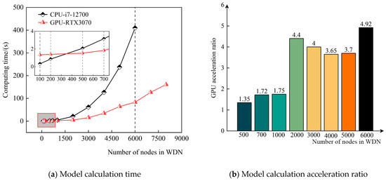 The computational results of the model are shown in Figure 7. Regarding the maximum scale of the water distribution network that can be computed, as indicated by the dashed line in Figure 7a, the CPU-i7-12700 device can handle up to 6000 nodes in the network model due to its memory capacity. Beyond this scale, the computational efficiency of the model significantly decreases, and the computer may even freeze. In contrast, the GPU-RTX3070 can compute a network model with up to 8000 nodes, indicating that the GPU model can handle larger water distribution networks and is better suited for the computational demands of large urban water distribution systems.