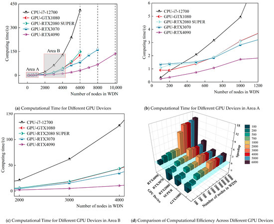 Figure 8c shows that when the number of network nodes reaches 2000, 3000, 4000, and 5000, the computation times for the GPU-GTX1080 and GPU-RTX2080 SUPER are very close, unlike the noticeable differences observed between other GPU devices. This similarity suggests that the two GPUs have comparable performance characteristics. A comparison of the parameters in Table 4 reveals significant differences in the computing architecture, transistor count, stream processor count, single-precision floating-point performance, and memory bandwidth between the two GPUs, with the GTX1080 being less powerful than the RTX2080 SUPER. However, both GPUs have the same memory capacity, indicating that memory capacity is a critical factor limiting computational performance in large-scale matrix inversion. Therefore, when performing large-scale parallel computations, it is advisable to prioritize GPUs with higher memory capacity. However, for particularly large network scales, other GPU parameters should also be considered. For example, although the RTX3070 and RTX2080 SUPER have the same memory capacity, their computational efficiency in large network models differs significantly, which is closely related to other GPU parameters. This observation aligns with findings in other studies [41,46,47]. Therefore, when choosing a GPU for solving water distribution networks, it is recommended to first select a device with higher memory capacity. If memory capacities are the same, other key performance metrics should be considered to maximize GPU performance while minimizing costs.