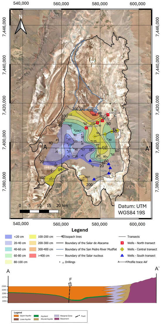 In the northern area of the Salar de Atacama, around the locality of San Pedro de Atacama, several deep boreholes up to 500 m have been drilled, revealing the presence of a thin unconfined aquifer and an artesian aquifer [54]. Subsequent studies conducted in this sector have also report the existence of the unconfined and confined aquifers [55,56]. These investigations have suggested that the recharge of the unconfined aquifer occurs as a result of the upward vertical flow from the confined aquifer to the unconfined aquifer through infiltration [55,56]. It has also been reported that groundwater recharge to the center of the salar occurs through the unconfined aquifer; although there is insufficient evidence regarding how the confined aquifer extends southward towards the nucleus [56]. This coincides with the main recharge source determined from the piezometry of the upper part of the Salar de Atacama aquifer [12]. There are not many boreholes north of the halite nucleus that allow for the clear determination of how the aquifers described in the northern part connect with the halite nucleus. However, detailed geological knowledge exists for the northern part of the same halite nucleus [29]. As shown in Figure 2, the thickness of the aquitard composed of gypsum and organic matter increases towards the northern part. Additionally, up to five extensive layers of gypsum have been described in the northern part of the halite nucleus, which could have played an important role in confining water from the northern part of the Salar de Atacama [29].