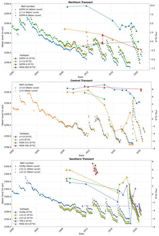 The evolution of the isotopic composition of δ18O and the piezometric drawdowns in the wells in the northern, central, and southern transects of the halite nucleus.