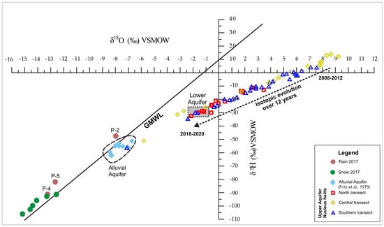 Unlike the general trend in the northern transect, where the isotopic values of the wells closer to the pumping well field generally showed a trend towards lighter δ18O values, this trend is not present in the central transect, and the observed values tend towards enriched δ18O values. It is difficult to explain the observed isotopic values in wells MSW-275 and MSW-246. The data on the thickness of the aquitard in this sector indicate that it reaches its greatest thickness here [29]. One possible way to explain the more enriched δ18O isotopic values relates to the increased thickness of the aquitard in this sector. The increase in aquitard thickness could hinder the upward vertical flow from the lower aquifer to the upper aquifer. However, since this sector is closer to the pumping well field, this scenario should be viewed with caution.