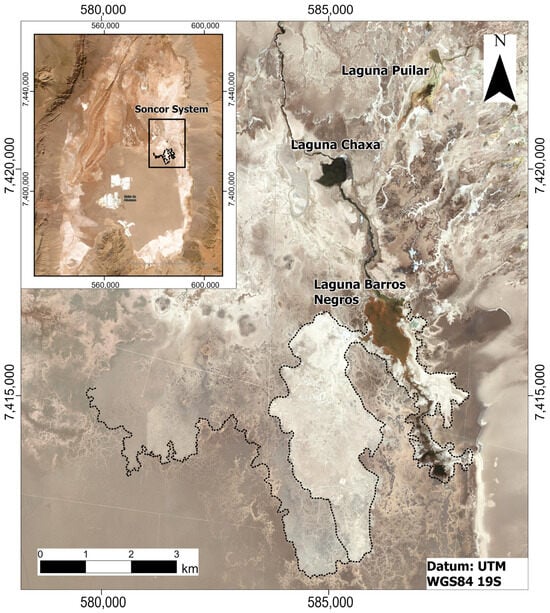 In the northeastern part of the halite nucleus, which is in contact with the marginal zone, there are a series of streams and lagoons known as the Soncor system (Figure 7). This system has been extensively studied using environmental isotopes and flow rates to understand the fate of the waters originating from a series of springs in the marginal zone, which are channeled towards the boundary with the halite nucleus, where these waters eventually stagnate in small lagoons subject to intense evaporation [3,4,47]. The largest identified lagoons in this sector are Puilar Lagoon, Chaxa Lagoon, and Barros Negros Lagoon. The surface water flow originates from the groundwater discharge zone near Puilar Lagoon and continues to Chaxa, finally ending in Barros Negros. The waters of Barros Negros Lagoon show the most significant effects of enrichment due to evaporation, with the measured δ18O values reaching up to +20‰ [3], but the extreme values also indicate that the through flow from the lagoon, at least at the surface, is minimal at these times [50]. The wells located around Barros Negros show δ18O isotopic values ranging from +9 to +12.5‰ [47]. The isotopic values of the wells around Barros Negros Lagoon can be interpreted as the result of the recharge of water from this lagoon infiltrating into the subsurface when there is a greater amount of water and a hydraulic head capable of producing infiltration. When the lagoon levels are lower and there is no hydraulic head sufficient to promote infiltration, the water continues its evaporation process, and the highest values exceeding +20‰ are reached. Figure 3 shows some of the isotopic values from the Puilar, Chaxa, and Barros Negros Lagoons, illustrating this evolution in the isotopic composition of these waters. The lighter isotopic values obtained in the same lagoon correspond to the samples taken in winter, while the more enriched values correspond to the samples taken in summer when evaporation is greater [47]. The recharge mechanism, from the lagoons to the aquifer, has also been demonstrated hydrodynamically, based on the increases in piezometric levels recorded when flooding occurred in the lagoons as a consequence of important precipitation events in the southern part of the Salar de Atacama [51].