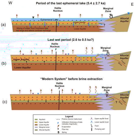 The evolution of the brine stored in the halite nucleus. Note the increase in the thickness of the upper aquifer from the Holocene to the present. (a) Period of the last ephemeral lake (5.4 ± 2.7 ka); (b) Last wet period (2.6 to 0.5 ka?); (c) “Modern System” before brine extraction. More detail is found in the text. Exaggerated vertical scale.