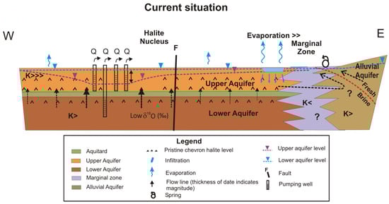 The higher permeability of the upper aquifer initially led to most of the brine extraction being conducted from this unit, creating a hydraulic imbalance between the upper and lower aquifers (Figure 9). For a better understanding of the current conceptual flow model, this figure also includes indicators of the relative permeabilities between the different hydrogeological units of the system. Since the upper aquifer has a lower hydraulic head than the lower aquifer, an upward vertical flow of water from the lower aquifer through the aquitard is illustrated. In this sector, the recorded drawdowns reached up to 10 m between 1986 and 2020. The increased brine extraction has generated greater hydraulic head differences between the upper and lower aquifers, inducing greater upward vertical flows. Conversely, in areas further from the well field, the hydraulic head difference between the two aquifers is expected to be smaller, resulting in smaller upward vertical flows in the short term, but which could become significant in the long term (Figure 9). Since 2012, there has been a significant increase in the extraction rates from the nucleus wells, reaching 1.6 m3/s in 2018 [13]. This increase has led to a significant expansion of the drawdown cone, which has extended to nearly the entire halite nucleus, causing substantial drawdowns.
