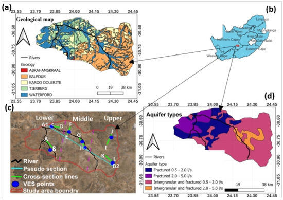 (a). The geological map depicting the sedimentary and igneous outcrops of the basement rocks, (b). Show the location of the study area within the Northern Cape Province, South Africa. (c). Topographical landscape, including the locations of the VES points, regional pseudo section lines, cross-sections lines, drainage by the Brak River and Elandsfontein Spruit. (d) Various aquifer types as well as yield from each aquifer type.