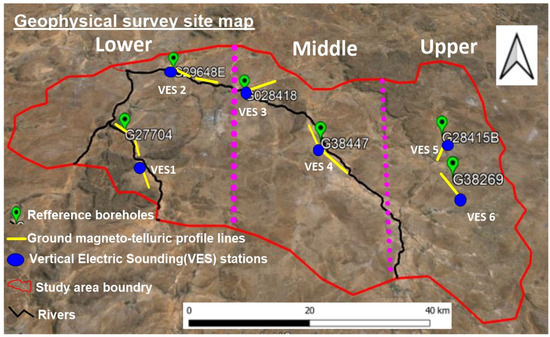 Study area map showing the geophysical field sites displaying the locations of vertical electric sounding stations and ground telluric profile lines.