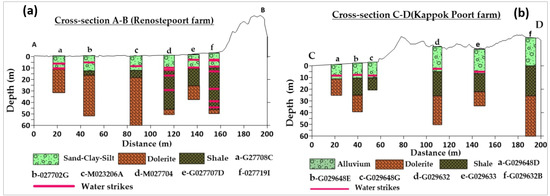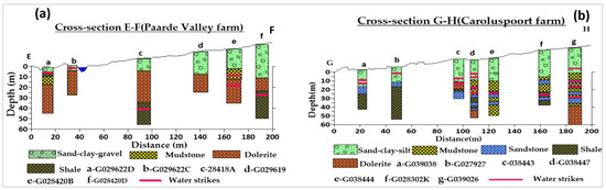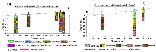 (a,b). The lithological cross-sections of the boreholes were used to calibrate and validate the aquifer types in Zewefontein farm, upper catchment area.