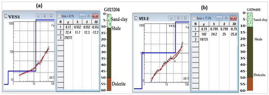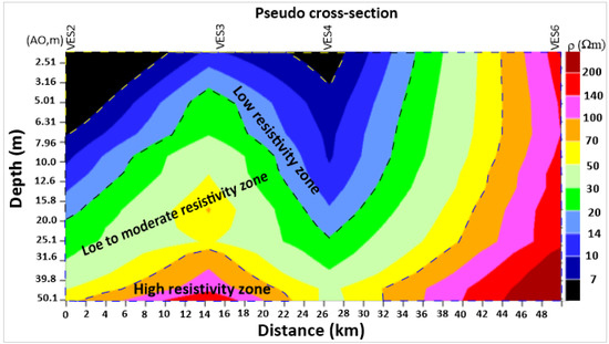 Seven VES stations were strategically placed throughout the study area to map various aquifer types, distinguishing between unconfined and confined aquifer layers along the survey lines [32]. At least two VES stations were established in each of the three catchments (i.e., lower, middle, and upper). Interpretation of the VES data involved partial curve matching using IP2WIN (lite) software [12,33], where plots were compared with standard master curves to determine optimal layer parameters such as resistivity, thicknesses, and depths. This process facilitated the development of an electrical resistivity–depth model for each area [34]. The electrical resistivity values were used to create 1D spatial curve graphs illustrating the layers of subsurface geometry [35]. The electrical resistivity and thickness values were interpolated to create two-dimensional (2D) regional pseudo-cross-sections A1–A2. These pseudo-cross-sections, derived from subsurface electrical resistivity data, were subsequently interpreted to describe each electrical resistivity layer and correlated with corresponding borehole log cross-sections.