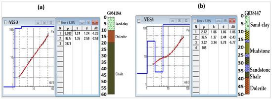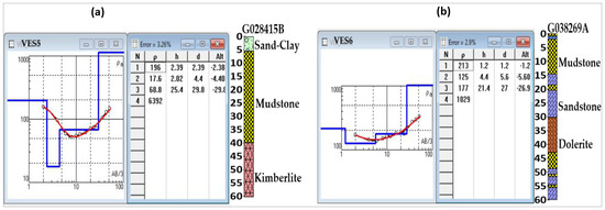 The interpretation of the vertical electrical sounding (VES) curves involved analyzing the apparent electrical resistivity and grouping them to create a regional pseudo-cross-section of the area (Figure 11). The data from VES stations were processed, interpreted, and analyzed using the IPI 2win software. Apparent electrical resistivity values were plotted against electrode spacing AB/3, with data error margins of 8.1% (VES1), 17.3% (VES2), 6.39% (VES3), 3.5% (VES4), 3.2% (VES5), and 2.9% (VES6) (Figure 8, Figure 9 and Figure 10). The AB/3 electrode spacing is recommended for the Wenner array, while the Schlumberger array uses an AB/2 electrode spacing. An acceptable apparent resistivity error is less than 10% to avoid overfitting or underfitting the data. The electrical resistivity values were correlated with the geological log obtained from a nearby borehole presented in Figure 5, Figure 6 and Figure 7. The findings presented in Figure 8, Figure 9 and Figure 10 suggest a subsurface medium consisting of multiple layers, typically three to four significant layers identified based on varying apparent electrical resistivity values. The first layer in the lower and middle catchments indicates the topsoil, sand, clay, and silt aquifer material, the second and third layers are dominated by interchanging weathered shale, sandstone, mudstone, and siltstone, and lastly, the fourth layer mainly weathered dolerite at a shallow depth and compacted hard dolerite at a deeper depth. Woodford [27,28] described the occurrence of alternating sandstone, mudstone, and shale in elevated terrain as potential groundwater recharge aquifers. As previously indicated, nearby borehole logs were utilized to correlate and calibrate the interpreted electrical resistivity data to demonstrate groundwater potential recharge areas. The interpretation of vertical electrical sounding (VES) results demonstrated a strong correlation between resistivity data and borehole logs, with consistent layering observed across all profiles. Figure 8, Figure 9 and Figure 10 present the comparison between electrical resistivity data and borehole logs obtained from the Department of Water and Sanitation (DWS). In the lower catchment, VES 1 and borehole G023206A, as well as VES 2 and borehole G029648E, revealed three distinct layers characterized by variable resistivity with consistent thickness and depth at the surface. This variability reflects a heterogeneous geological formation, including sand, clay, and silt at the top, transitioning to moisturized shale and dry dolerite below the surface. The low-electrical resistivity (0.9–8.1 Ωm) in the lower catchment can be attributed to differences in soil moisture and clay content. At depths greater than 12.3 m (VES 1) and 25 m (VES 2), the high resistivity is associated with the onset of dry hard rock formations such as dolerite sills or dykes. In this area, groundwater strikes are frequently encountered at depths below 10 m, consistent with the geological cross-sections. These findings align with the results of Araffaet al. [4], who found that clay formations in the survey area were indicated by low-resistivity values (<100 Ωm), while sand layers in the central part of the study zone were characterized by high-resistivity values (>600 Ωm). Their study proved that resistivity data can be valuable for detecting clay layers and mapping subsurface structures. Three to four layers were identified in the middle catchment, with variable resistivity and consistent thickness and depth near the surface (topsoil). Geologically, VES 3 and logs in borehole profile G38418A, as well as VES 4 and logs in borehole profile G38447, were characterized by low-resistivity (0.98–2.72 Ω), and moderate-resistivity (3.82–97.5 Ωm) shale, and alternating sandstone and mudstones influenced by groundwater accumulations at depths between 5 and 40 m as well as high resistivity (705–3978 Ωm) of unweathered dolerite below 40 m depth (Figure 9a,b). According to a study conducted by [22] in Kakia and Esamburbur Sub-Catchment Narok, Kenya, low-resistivity values indicate the presence of a high density of fractured and porous zones, which are considered major recharge sites. Good correlations between resistivity and geological logs were noted, demonstrating how hydrogeophysical tools can effectively delineate aquifer systems and enhance the identification of recharge areas. Extremely high resistivity between 2.59 m and 5.78 m at VES 3 suggests the beginning of bedrock formation, while dry sandstone or mudstone formation is observed at VES 4. In the upper catchment (headwaters), four layers were identified as moderate (196–213 Ωm) to high resistivity (1029–6392 Ωm). The high resistivity is attributed to dry mudstone and sandstone near the surface layer, with underlying dolerite and kimberlite pipes below the surface (Figure 8, Figure 9 and Figure 10). High resistivity below 30 m is linked to unweathered rocky gravel layers and intrusive rocks. These results are like a study conducted by Khan et al. [23], whereby high-resistivity values were attributed to the presence of highly cemented rocks or sandstone with low porosity and therefore less recharge potentiality. The result of this nature also justifies the beginning of bedrock formation. The geological log from boreholes indicates that groundwater is more frequently encountered in the alluvium (clay and sand) and the weathered fractured zones (comprising shale, sandstone, and mudstone) of both the upper and lower contact zones, compared to dolerite and kimberlite pipes (Figure 5, Figure 6 and Figure 7). According to Vegter [14], sedimentary layers directly overlying dolerite yield significantly higher water strikes than the dolerite itself, and sandstone exhibits more frequent water strikes than other sedimentary and igneous layers. The assessment of the borehole cross-section log shows that most boreholes have penetrated the Ecca group of shale, sandstone, mu