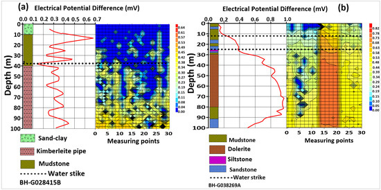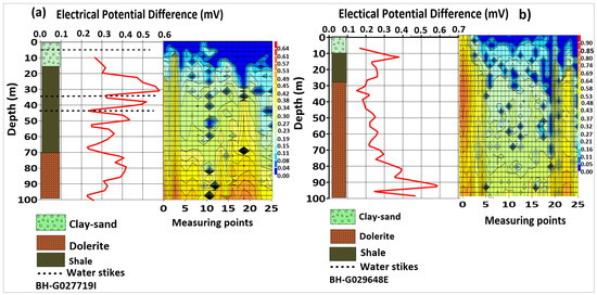 In the lower catchment area, the lithological logs of reference borehole G027719I reveal groundwater at depths of 4 m, 9 m, 12 m, 24 m, and 42 m within sand, shale, and dolerite formations (Table 1). For reference borehole G029648E, groundwater was found at 8 m within an alluvium formation (sand). The groundwater level of the two boreholes was measured at 3.13 m and 4.83 m. A ground telluric survey was carried out near these reference boreholes, and the resulting electrical potential difference (EPD) measurements were used to categorize aquifer units as either confined or unconfined by comparing them with the lithological logs. Figure 12a,b, where blue indicates water, show groundwater accumulations at depths between 5 and 15 m, characterized by low EPD values of 0 to 0.3 mV (representing alluvium formation, including sand, clay, and silt) and 0.3 to 0.5 mV (representing semi-confined formations of clay and shale). A significant increase in the potential difference indicates the transition to the bedrock basement of the dolerite sill. These findings support the integrated approach of Abdul Jabbar Khan et al. [23] in the north-western part of Pakistan, who compared ground magnetotelluric survey results with nearby borehole logs.