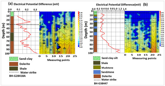 This section details the analysis and interpretation of results from the survey conducted in the middle catchment area along reference boreholes G028418A, and G038447 (Figure 13a,b). The groundwater level of these two boreholes was measured to be 3.86 m and 4.77 m (Table 1). The two profile images reveal weathered vertical fractures at depths ranging from 20 m to 75 m between measurement points 12 and 22 (Figure 13a), and at depths from 10 m to 30 m between points 3 and 15 (Figure 13b). The positioning and dip of these fractures may indicate potential groundwater recharge zones and areas of preferential flow for groundwater–surface water interactions. The relatively low potential difference (<0.3 mV) suggests weathered and fractured zones composed of clay, shale, sandstone, or mudstone, which could be potential recharge or groundwater occurrence zones. Conversely, a high divergence in the EPD curve up to 0.5 mV at a depth between 20 m and 50 m indicates shallow compacted hard rock formations, like dry fractured sandstone, and 0.65 mV at a depth between 70 m and 100 m point to deep fractured dolerite formation (Figure 13a,b). These findings align with Gomo’s study, which indicated that higher electric potential differences are associated with electrically resistive formations like fresh dolerite and dry sandstone. Similarly, Oyegoke et al. [20] reported that deep vertical dark blue and light blue colors signify significant vertical fracturing. The results of this study are consistent with lithological data calibrations and water level elevations, suggesting that the primary aquifer consists of alluvial sediments at shallow depths and fractured, weathered gneiss at greater depths. According to Faleye et al. [40,41] aquifers connected to river channels are recharged by these faults or fractured systems.