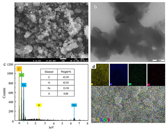 Figure 1 illustrates the morphological characteristics of the synthesized Fe NPs. The nanoparticles exhibited a quasi-spherical shape (Figure 1a), indicating their excellent dispersibility. TEM analysis further confirmed that the Fe NPs ranged in size from 75 to 105 nm (Figure 1b). Compared to iron-based nanoparticles synthesized using sodium borohydride, these Fe NPs displayed a variety of shapes, likely due to the influence of the biomolecular constituents from the pomegranate leaf extracts []. The elemental analysis through EDS in Figure 1c reveals that C, O, Fe, and S accounted for 43.59%, 42.95%, 12.58%, and 0.88% of the weight, respectively. The detection of iron peaks confirmed the successful synthesis of the nanoparticles, while the presence of oxygen suggested the formation of iron oxides. The C and O signals were attributed to the organic components of the pomegranate leaves, and the S signal originated from the precursor, FeSO4·7H2O. As shown in Figure 1d, the elements C, O, Fe, and S were uniformly distributed across the sample, indicating that the synthesis process involved interactions between iron and active biomolecules in the pomegranate leaf extracts. Additionally, the relative atomic content indicated that active biomolecules contributed to over 80% of the weight of the surface and near-surface regions of the Fe NPs.