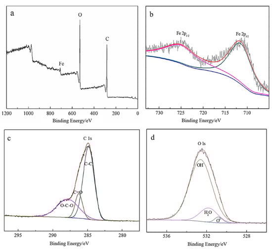 Detailed XPS analysis of Fe NPs: (a) full survey spectrum; (b) high-resolution spectra of Fe 2p; (c) spectra of C 1s; (d) spectra of O 1s.
