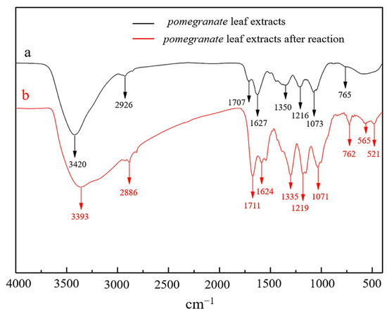 FTIR spectra of pomegranate leaf extracts before and after reacting with Fe2+ solution.