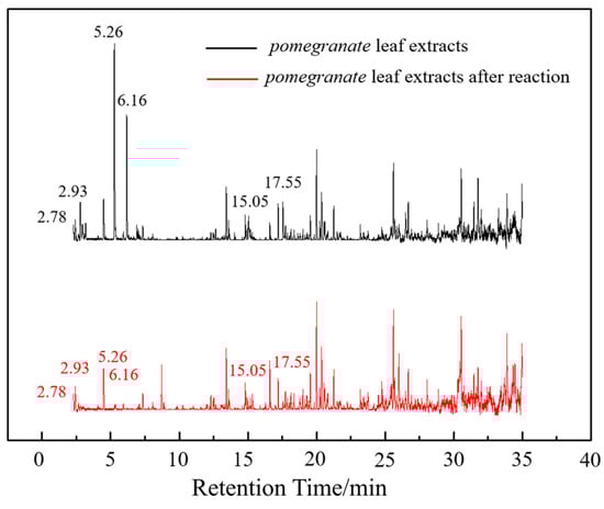 Pomegranate leaf extracts were subjected to GC-MS analysis using an Agilent 7890B GC system equipped with a split/splitless injector, coupled to an Agilent 5977A MSD mass spectrometer (Agilent Technologies, Santa Clara, CA, USA). The injector’s inlet temperature was meticulously maintained at 573 K. System operations were seamlessly managed via Agilent MSD ChemStation software (MassHunter Qualitative Analysis B.07.00). Chromatographic separation was achieved on an HP-5 fused silica capillary column (30 m × 0.25 mm × 0.25 μm). Helium was utilized as the carrier gas at a pressure of 0.55 MPa, with a sample injection volume of 1 μL.