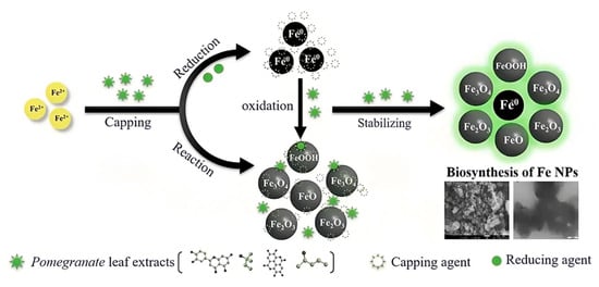 Iron-based nanoparticles (Fe NPs), characterized by their nanoscale size, extensive surface area, and the presence of zero-valent iron, have emerged as effective agents for the rapid removal of a wide range of contaminants from water []. Traditional synthesis methods, such as physical vapor deposition, chemical reduction, and hydrothermal synthesis, predominantly utilize liquid-phase reduction techniques. However, these approaches often encounter obstacles including nanoparticle agglomeration and environmental risks due to increased solubility in water [,,]. To overcome these challenges, recent research has increasingly focused on the development of environmentally friendly, cost-effective, and biologically safer nano-iron materials.