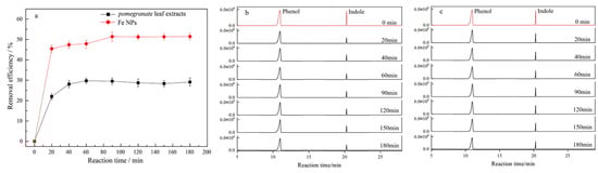 (a) Indole efficiency removal by Fe NPs and pomegranate leaf extracts; GC-MS chromatogram of indole removal by Fe NPs (b) and pomegranate leaf extracts (c).