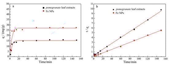 Adsorption kinetics curve: (a) pseudo first-order kinetics model; (b) pseudo second-order kinetics model.