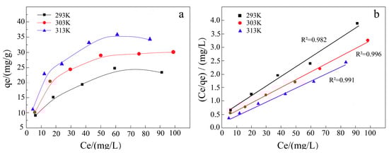 (a) Adsorption isotherms at different temperatures, (b) Ce/qe–Ce relationship points and linear fitting.