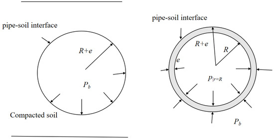 Here, R is the internal diameter of the pipe and e is the pipe wall thickness. At the pipe–soil interface, σb = Pb and εr|r=R+e = εrm|r=R+e. Here, εrm is the radial strain of elastic soil [20]. In the radial direction of the boundless elastic soil, the relationship between stress and strain is expressed as follows [21]: