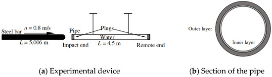 Figure 2 shows the device implemented in [28], which is a 4.5 m double-layer pipe fixed by suspension to ensure that it is only impacted by a 5.006 m-long solid steel rod during the experiment. It is worth noting that both the inner and outer pipelines are made of elastic materials, which enable them to undergo appropriate deformation under stress and, subsequently, to restore their original state. This characteristic is highly consistent with the characteristics of pipeline materials used in engineering practices.