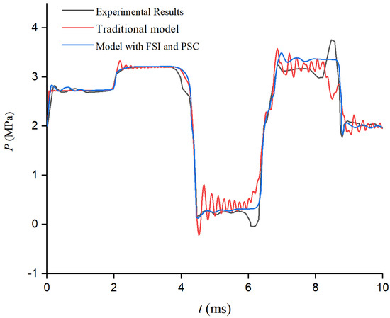The axial strike produces a high-frequency pressure fluctuation in the pipe. The time step in the simulations is as small as 10−4 s in order to capture the features of the pressure fluctuation. Figure 3 presents the experimental outcomes, alongside the simulation results, derived from both the traditional model and the advanced FSI and PSC methodologies.