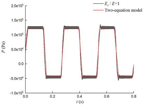 With Es/E = 0, from Equation (18) we can obtain Pb = 0, p|r=R ≠ P, which means that there is no PSC in this system and that there are still pressure differences in the radial direction of the pipe. Thus, only Poisson coupling and junction coupling are present in the system, with unavoidable piping vibrations, and our model degenerates into a four-equation model. On the other hand, with Es/E = ∞, the results display Pb = p|r=R = P. Thus, there is no pressure difference between the inside and outside of the pipe wall, and the vibration of the pipe is not considered. Our model reduces to a classical two-equation model. As shown in the above-mentioned results, this model has wide applicability and can be jointly verified using the suspension pipe experimental results and the numerical results simulated by a two-equation model.