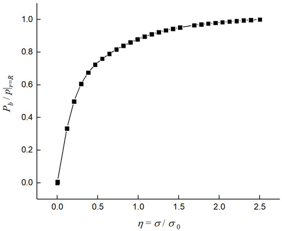 Equations (10) and (11) reveal that we acquired the waveform of Pb/p|r=R, which varies with Es/E or σz, as shown as in Figure 7 and Figure 8. From Figure 7, we found that the variation in Pb/p|r=R becomes smaller with a larger η (η = σ/σ0), which is explained as follows. In the low-stress region, the pipe has a greater stiffness and the radial vibration accelerates faster, as shown in Equation (7). Figure 6 shows that the differences between the radial pressures on the inside and outside of the pipe wall increase, i.e., Pb/p|r=R has a greater difference, and pipe–soil coupling becomes stronger. On the other hand, the level of pipe–soil coupling in the low-stress area exhibits a large change; it is 30 times that of the high-stress area. This shows that, in the weak-coupling area, the pipe–soil coupling increases rapidly and then tends to ease until it is even and stable, which also shows that it is necessary to consider fluid–pipe–soil coupling in the refined model of fluid–structure interactions.