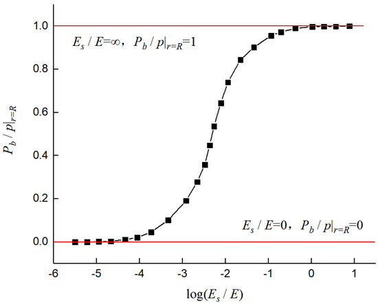 By changing Es/E = 0 to 1, we obtain, correspondingly, a value of Pb/p|r=R, ranging from 0 to 1. According to Equations (8) and (9), and considering the FSIs, the fluid energy is transmitted to the pipe wall and soil and converted into vibration energy in the former and pressure energy in the latter. Pressure energy enhancement (i.e., Pb was enhanced) was accompanied by a weakening of the vibration energy, which reduced the differences between Pb and p|r=R, (Pb/p|r=R, enlarged). Therefore, the enhancement of the restrictions on the pipe is always accompanied by an increase in Pb/p|r=R. From this perspective, Pb/p|r=R, can reflect the degree of the PSC responses. Pb/p|r=R, varies with Es/E and σz, as shown in Figure 7 and Figure 8, respectively.