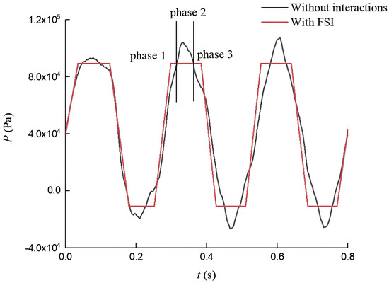 A stress wave propagates approximately three times faster than a pressure wave; thus, the surge during half of the period can be split into three parts, as shown in Figure 9. In the first part, ur > 0, the expansion of the pipe wall leads to the first pressure drop. Additionally, the robustness of the pipe is strengthened by the PSC, which weakens the pressure drop. Then, in the second part, ur < 0, the pipe wall contracts and compresses the fluid; this phenomenon is called the pumping effect. At the same time, the PSC mitigates this phenomenon. Lastly, in the third part, ur > 0, the axial stress wave bounces back, extending the pipe wall again, so that a pressure drop is caused, and, for the same reason as that in part one, the pressure drop is weakened by the PSC.