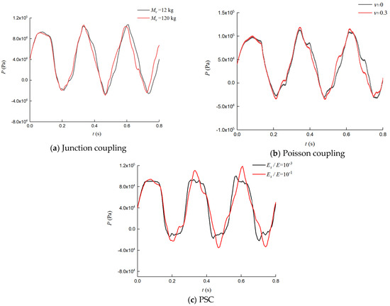 According to Equations (14) and (17), the radial expansion of the pipe wall (from FSIs) causes the restriction of the elastic soil on the pipe wall. Thus, the PSC is an important coupling form of FSI. We obtained numerical results for Pb and p|r=R, as shown in Figure 6; it is difficult to determine the degree of PSC responses using traditional computational models.